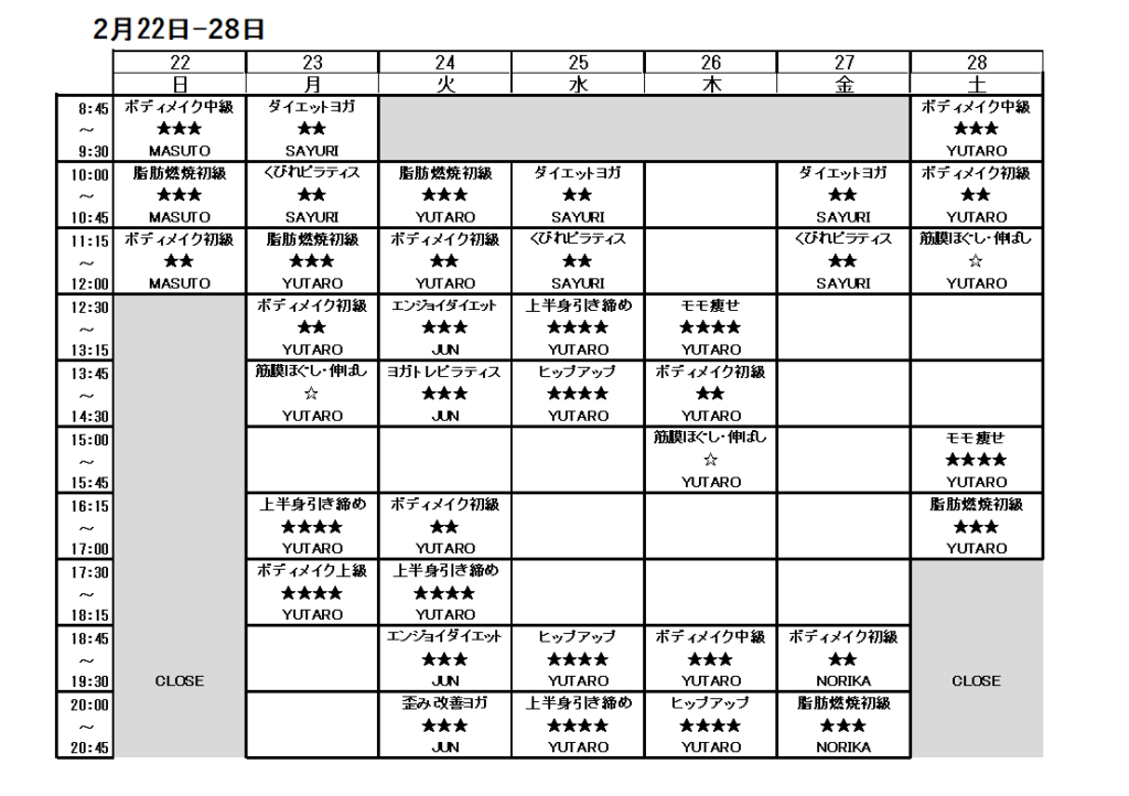 2/22-2/28スケジュール - セミパーソナルトレーニングジムMIRAIE